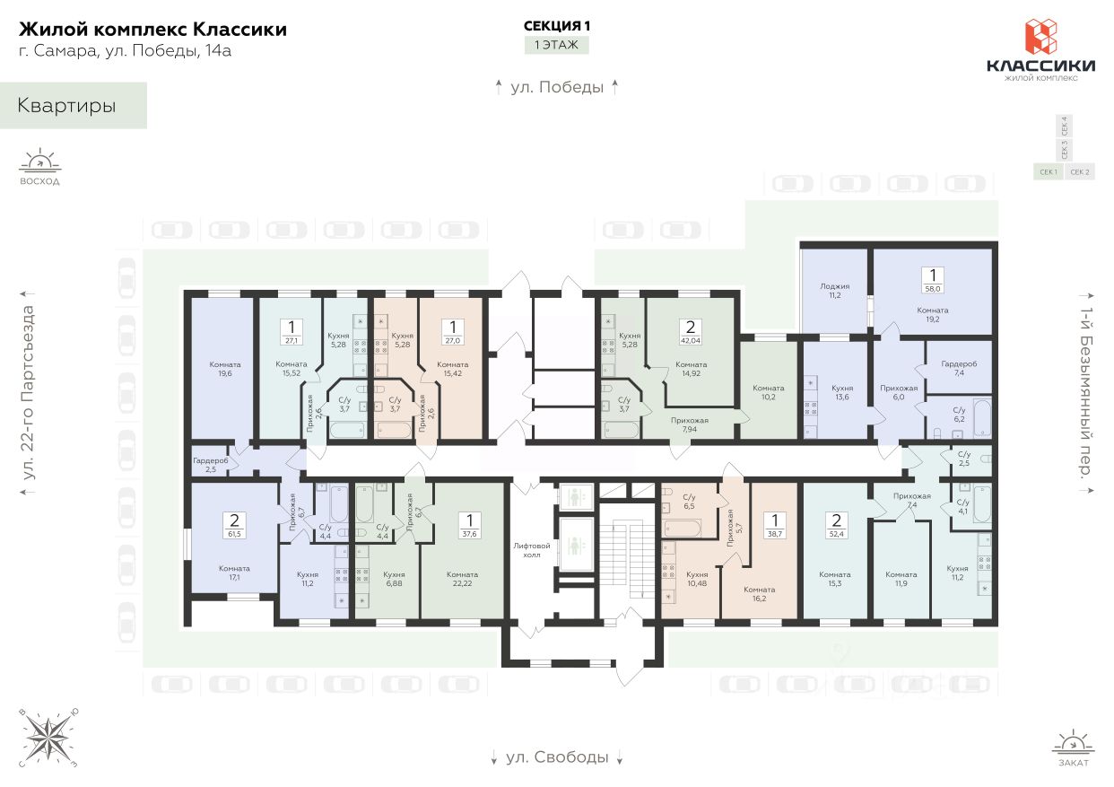 ЖК "Классики" — территория комфорта, вдохновлённая теплыми воспоминаниями. Это не просто дома, а пространство, наполненное легкостью и радостью, где каждый метр продуман для удобства жизни. Современная архитектура с панорамными окнами, функциональные планировки, просторные ванные и гардеробные — всё создано для вашего уюта. Здесь есть всё для комфортной жизни. Рядом — магазины, кафе, школы, клиники. Во дворе — безопасные игровые и спортивные площадки, зоны отдыха и зелёные аллеи. Безопасность обеспечивает круглосуточное видеонаблюдение, а профессиональная управляющая компания заботится о порядке и техническом обслуживании. Расположение — один из главных плюсов. Советский район, ул. Победы, 14А — престижный адрес с удобным выездом на магистрали, всего 5 минут до центра города. Всё, что нужно для жизни, отдыха и работы — под рукой. Дополнительные преимущества при покупке: - Полное юридическое сопровождение сделки купли-продажи - Помощь в реализации материнского капитала - Консультация и показ объекта в удобное для вас время - Содействие в подготовке и сборе всех необходимых документов
