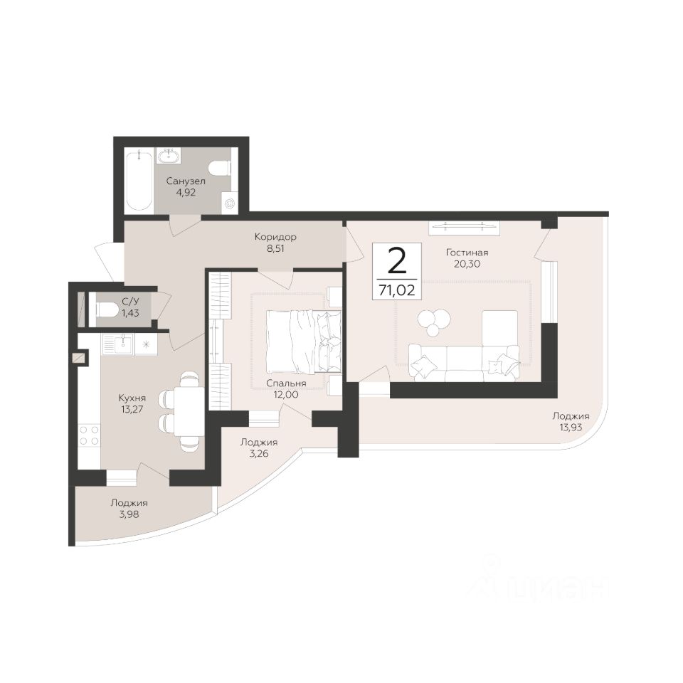 Продаётся 2-комнатная квартира в строящемся доме (Корпус 2), срок сдачи: III-кв. 2027, общей площадью 71.02 кв.м., на 2 этаже. Новый жилой комплекс "Скай" от застройщика "ГК Развитие" расположен по адресу Россия, Самара, улица Советской Армии.