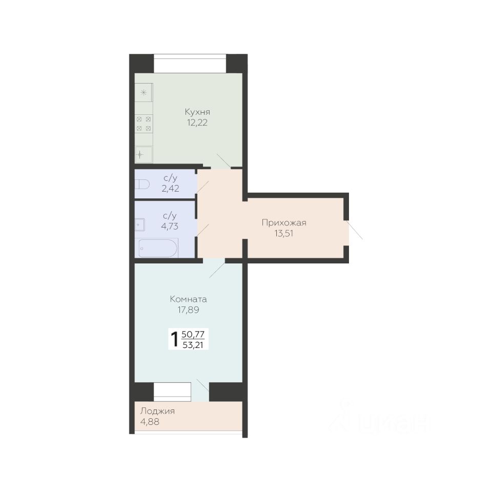 Продается 1-комн. квартира, 53,21 м²