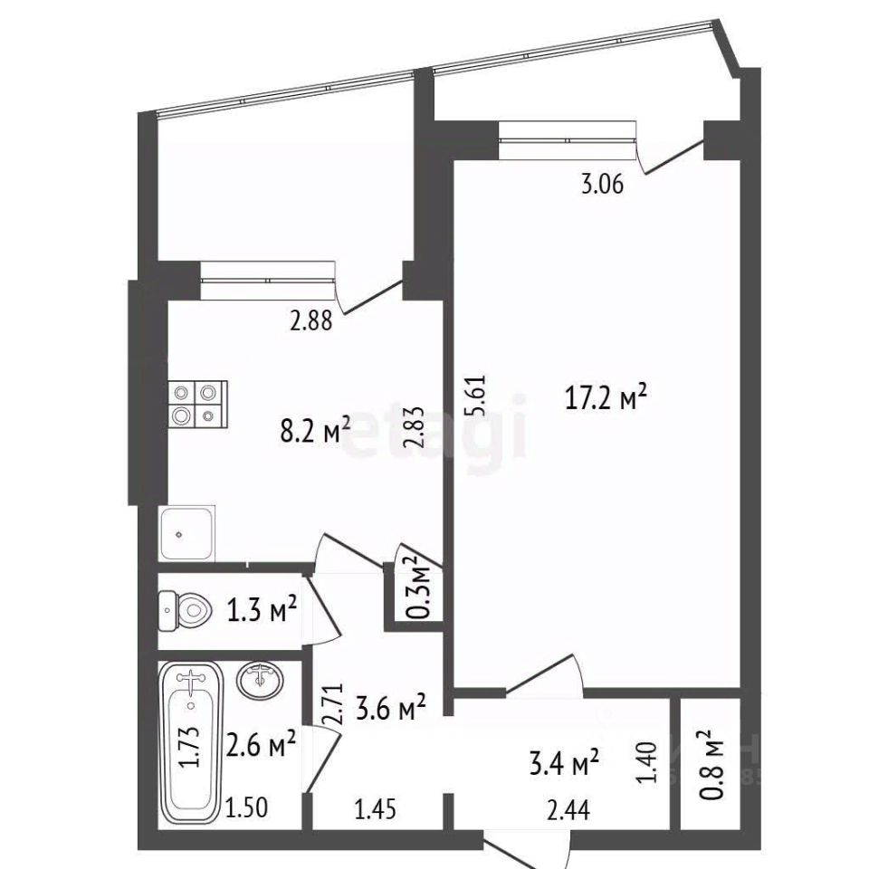 Общая площадь с учетом балкона и лоджии составляет более 43 кв.м, что обеспечивает дополнительное полезное пространство.