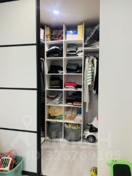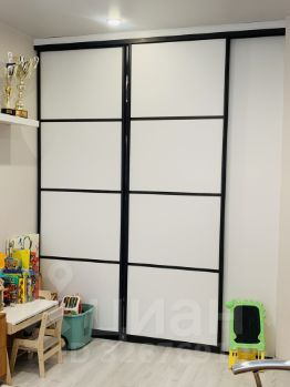 * комната с нишей, в нише оборудована гардеробная, установлена раздвижная перегородка, стеллажи - очень удобная система хранения