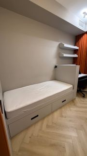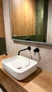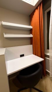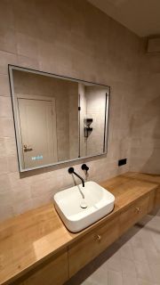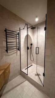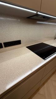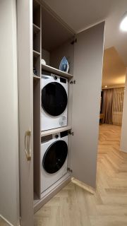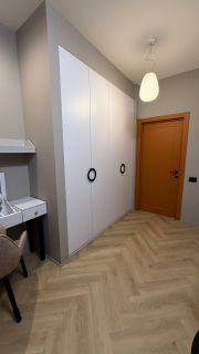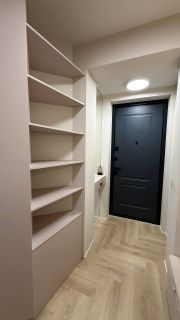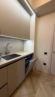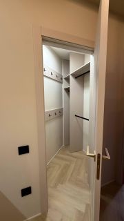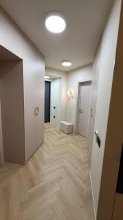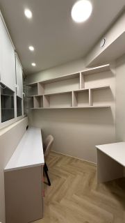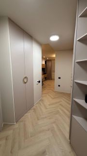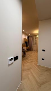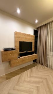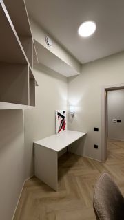 В квартире год назад был сделан качественный ремонт: сделано канальное кондиционирование (в потолке), потолок ГКЛ (натяжных нет нигде), стены идеально выровнены и окрашены моющейся премиальной краской, прeдусмoтpена удобная встроенная мебель и техника. Помимо жилых комнат есть гардеробная комната и отдельный рабочий кабинет. В гостиной есть спрятанное спальное место кровать-трансформер (днем выглядит как обычный шкаф). Кухня с фасадами МДФ, фартук и столешница кварцевый агломерат, без стыков и уголков, смеситель и мойка Omoikiri. В санузле испанская красивая плитка (вживую переливается от перламутровых вкраплений, фото, к сожалению, не передает этот эффект), черные матовые сантехнические приборы премиум класса, не накапливают налет и разводы. Розетки и выключатели итальянские Biticino living now. Единое напольное покрытие по всей квартире без стыков, порожков и перепадов.