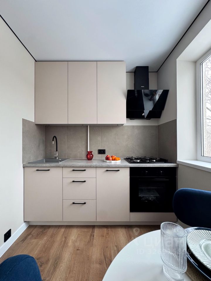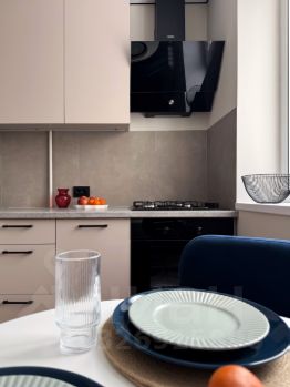 На кухне установлен кухонный гарнитур с новой встроенной техникой (электрический духовой шкаф, газовая варочная панель, вытяжка)