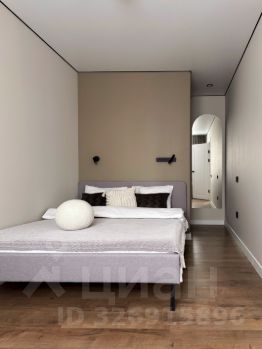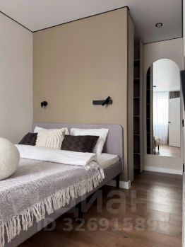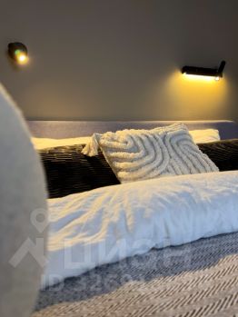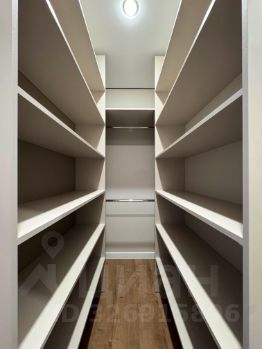 В спальне стоит большая двухспальная кровать (160 см). За кроватью расположена гардеробная с отдельным светом и зеркалом в полный рост.