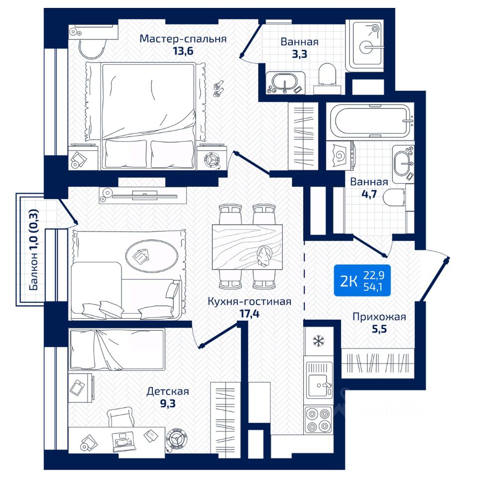 Общая площадь54,1 м²