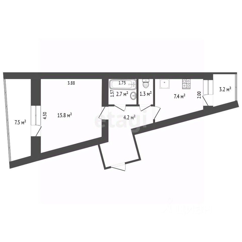 Ключевое преимущество — две застекленные лоджии: просторная (7.5 м²) примыкает к комнате 15.8 м², а вторая (3.4 м²) выходит из кухни 7.4 м², где остается кухонный гарнитур. Обе лоджии представляют собой практичный резерв для расширения жилого пространства. Планировка включает раздельный санузел и большой двойной коридор, повышающий функциональность.