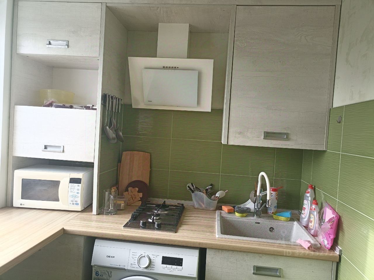 В квартире большой встроенный шкаф, дизайнерский кухонный гарнитур с удобными вместительными шкафчиками для хранения.