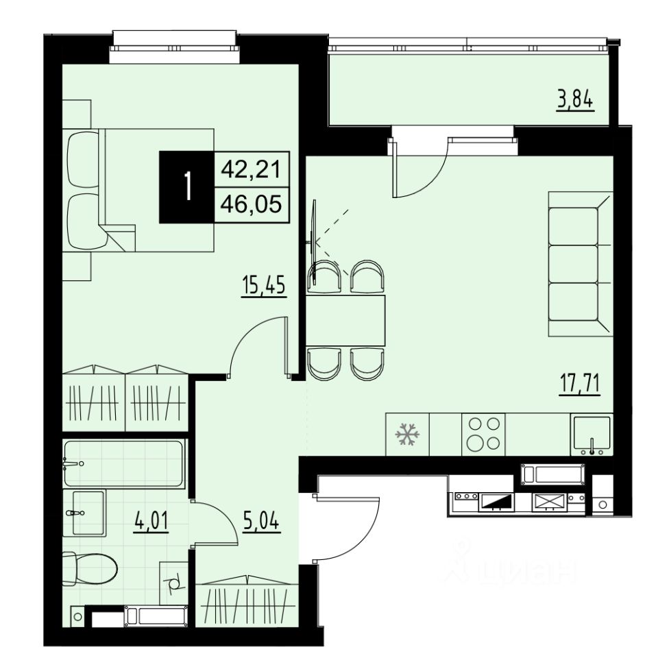 Умная планировка однокомнатной квартиры 46,05 м² в АМГРАДЕ продумана до мелочей: многофункциональная кухня-гостиная 17,71 м² объединяет обеденную зону, зону отдыха и зону готовки, и остаётся место для обустройства рабочего уголка. Из кухни есть выход на глубокую лоджию, где можно обустроить дополнительную зону хранения.