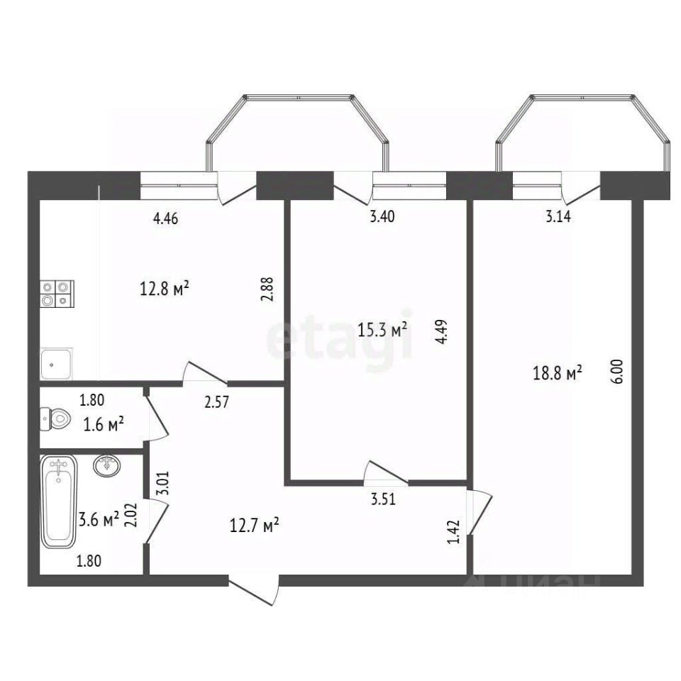 Планировка включает две изолированные комнаты 15 и 19 кв.м., просторную кухню 13 кв.м. и большой холл. Все помещения ориентированы на солнечную сторону, обеспечивая постоянное естественное освещение. Квартира оснащена двумя застекленными лоджиями: одна с выходом из кухни в комнату, вторая — из спальни. Санузел раздельный, установлена ванна и водонагреватель, все центральные коммуникации заменены управляющей компанией по программе капитального ремонта.