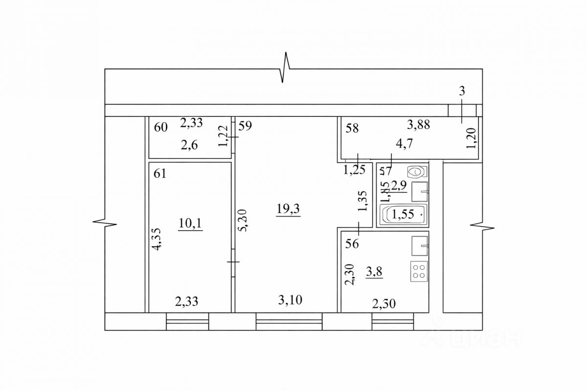 Общая площадь — 45,4 м², кухня — 5,8 м².