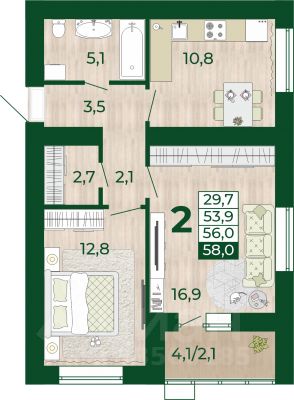Продаётся 2-комнатная квартира в строящемся доме (Дом 13), срок сдачи: III-кв. 2027, общей площадью 53.9 кв.м., на 3 этаже.