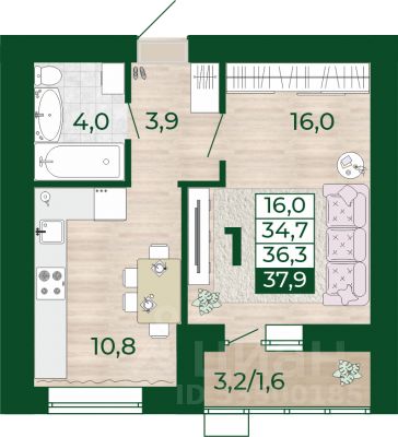Продаётся 1-комнатная квартира в строящемся доме (Дом 13), срок сдачи: III-кв. 2027, общей площадью 34.7 кв.м., на 15 этаже.