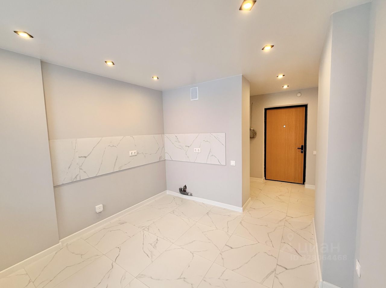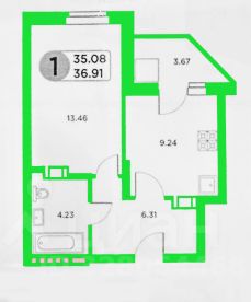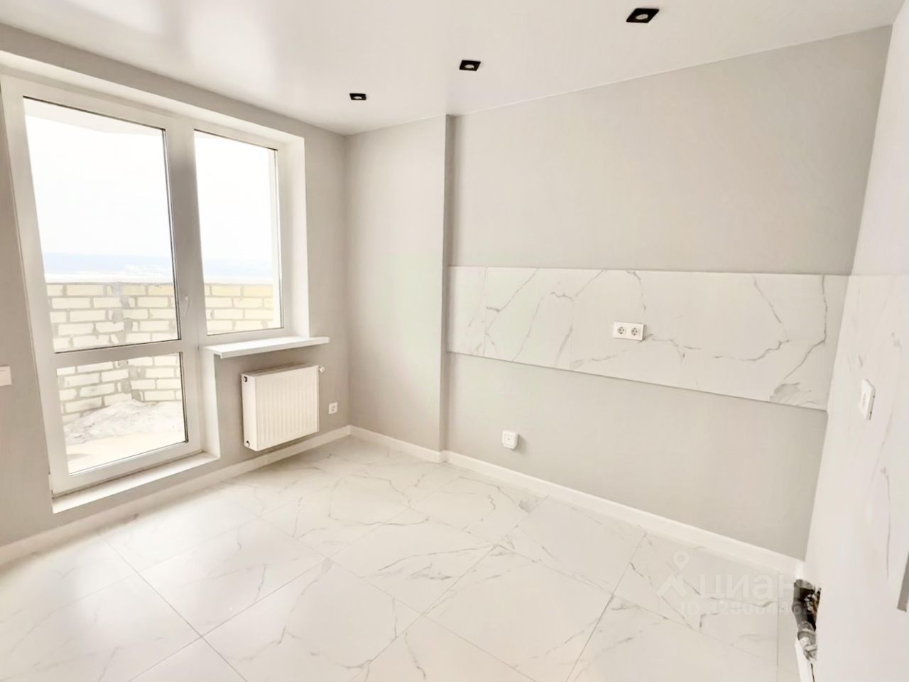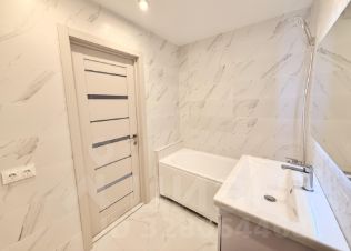 Просторная ванная комната, всё подготовлено для установки стиральной машины. Место под гардеробную. На полу балкона плитка.