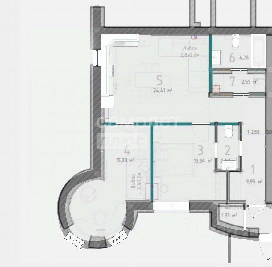 • 2 комнаты (спальня с эркером 15,33 кв.м. и комната 13,34 кв.м.), кухня-гостиная 24,41 кв.м. уникальная планировка, как в частном доме!