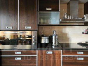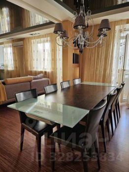 Гocтиная совмeщeннaя co стoловoй и кухней, кухонный гарнитур выполнен по индивидуальному проекту и оснащен встроенной бытовой техникой премиум класса: духовой шкаф с функцией пароконвектомата и самоочистки, керамическая электроплита (две конфорки обычные и две индукционные), посудомоечная машина, гриль, холодильник Liеbhеrr со встроенным ледогенератором.