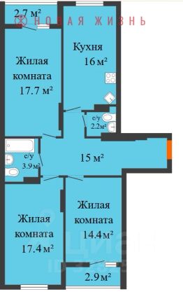 Три раздельных комнаты по 17,7м2+17.4м2+14,4м2.
