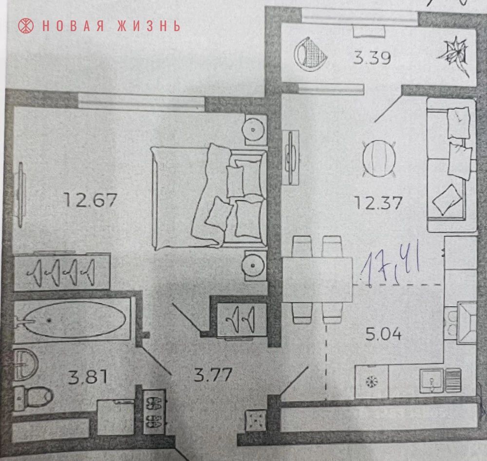 Функциональна планировка: кухня-гостиная 17,41 кв.м., комната 12,67 кв.м., сан. узел 3,81 кв.м.с выходом на теплую лоджию 3,39 кв.м.