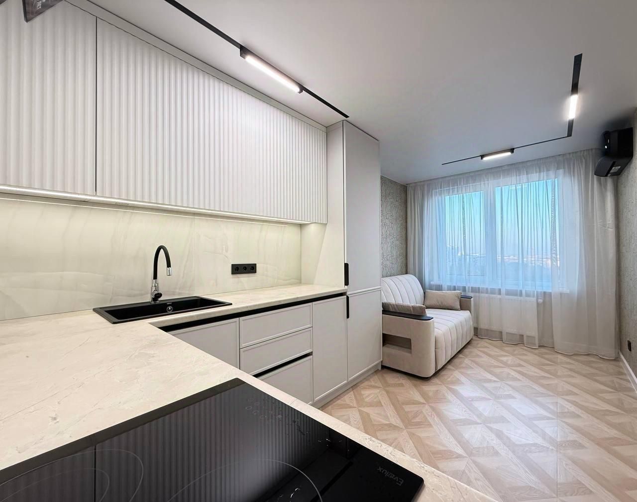 Кухня - установлен встраиваемый кухонный гарнитур с доводчиками, дорогая бытовая техника: Встраиваемый холодильник, встраиваемая посудомоечная машина, 3-х контурная варочная панель, отдельно стоящая вытяжка, духовой шкаф. Комната 1 - установлена скрытая гардина, кондиционер, диван-кровать.