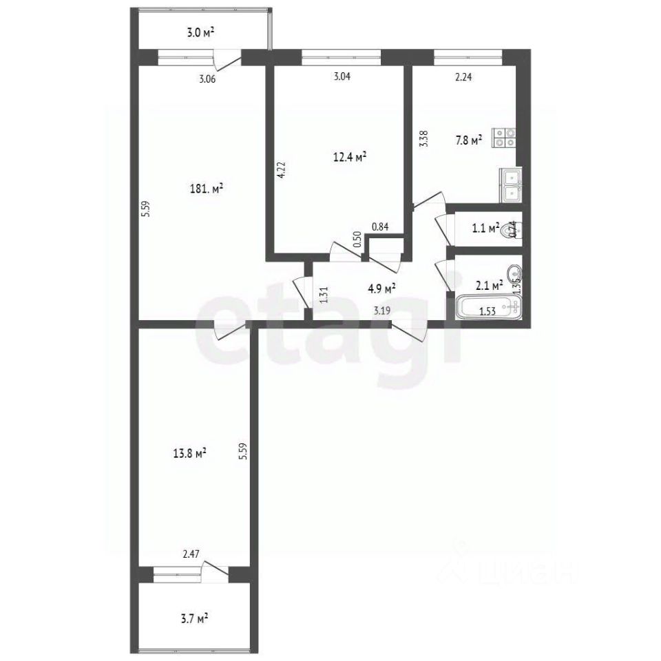Общая площадь — 59,1 квадратных метра.