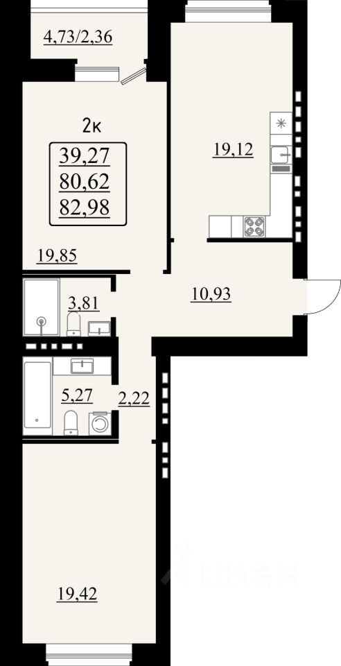 2-комн. квартира, 82,98 м²
