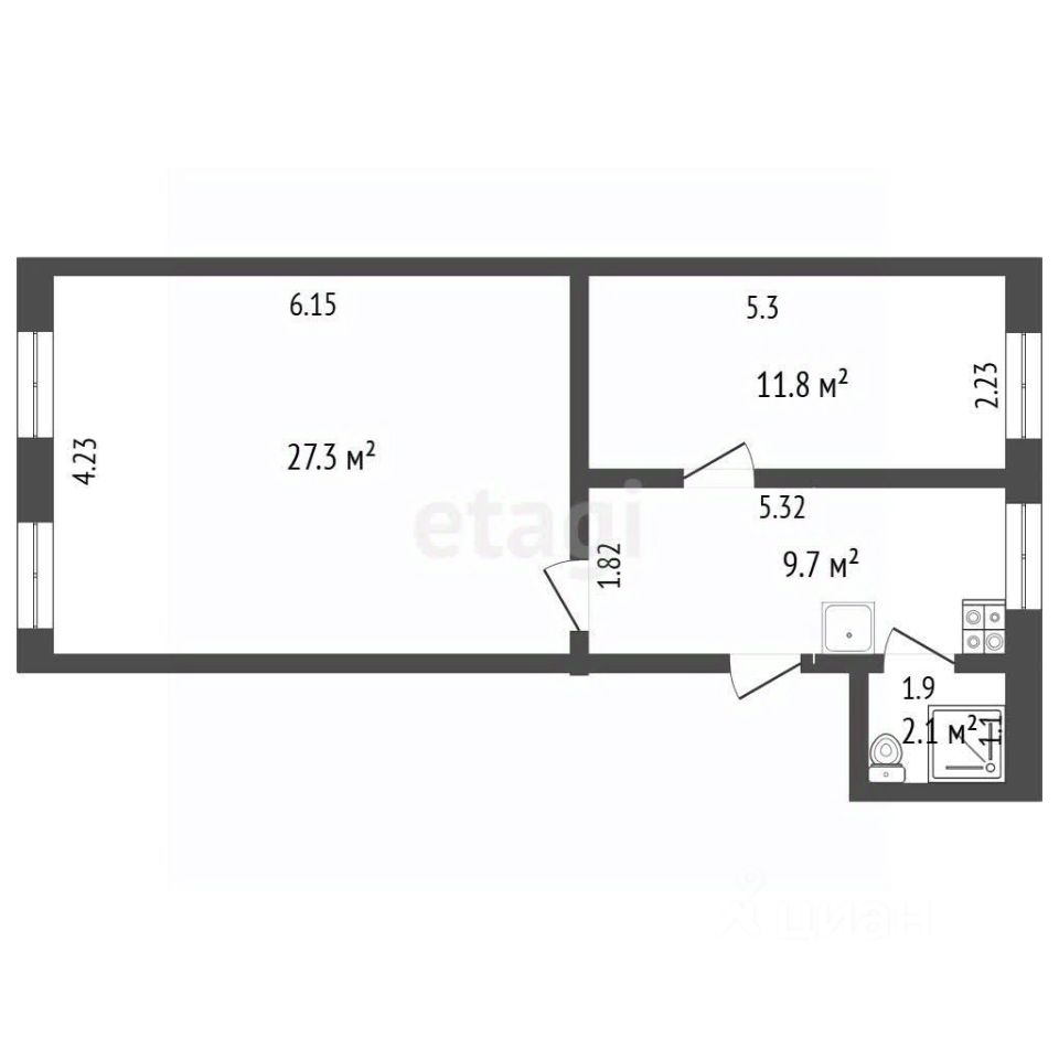 Пространство формирует две смежные комнаты - 27 кв.м., 12 кв.м, кухня 10 кв.м, санузел совмещен, установлена ванна.