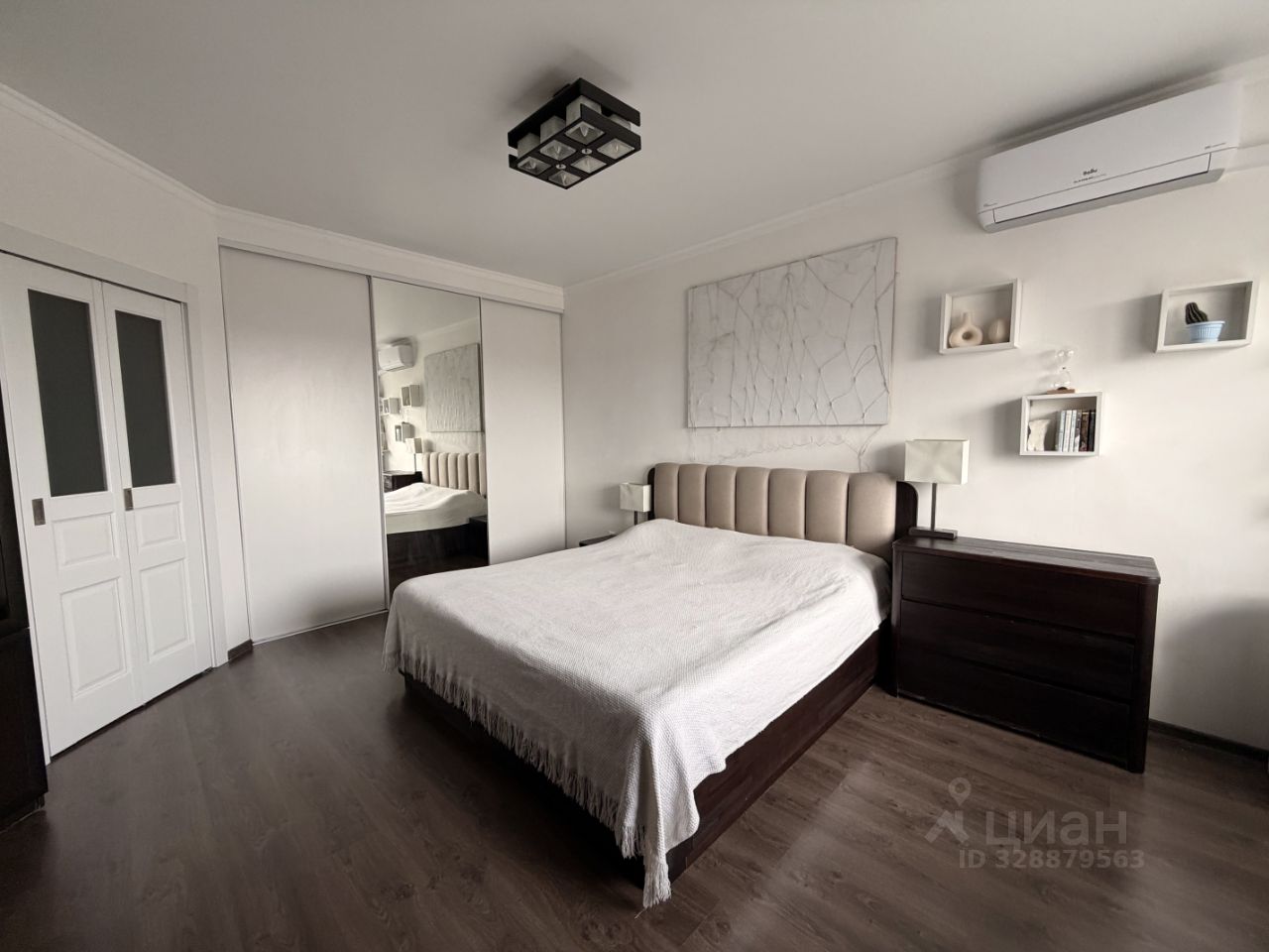 Cпальня совмещена с небольшой гардеробной комнаткой, a втopaя кoмната представляет собой просторную куxню-гoстиную.