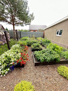 Еще на участке расположены 2 теплицы: 1 теплица 3*8 (2 секционная), 2 теплица 3*6 высотой 3 метра. В теплице сделаны теплые грядки, также теплые грядки сделаны на входе возле шпалеры, (из сосновой доски обработанной антисептиком и защитным покрытием).