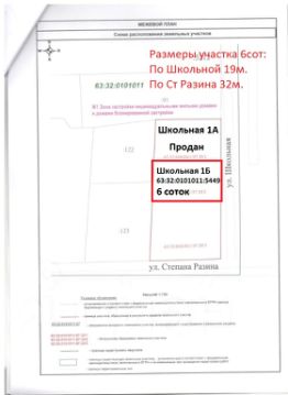 Межевание проведено, границы выделены. Школьная 1Б, 6 сот, кадастровый номер 63:32:0101011:5449.