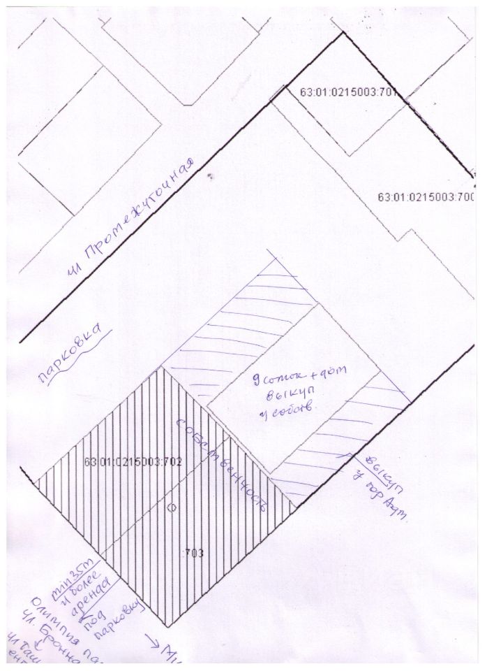 2 земельных участка 22.1 сотки (размер в плане 50м по ул.Бронная с выходом на Московское шоссе и 44.46м по ул.Промежуточной) кад.номера 63:01:0215003:702 и 703 с парковкой и разворотом Выезд- асфальт ул.Бронная на Московское шоссе, ул.Ташкентскую и ул.Демократическую