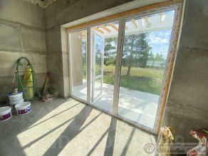 В доме 3 жилых комнаты. Огромная гостиная при входе в дом с панорамными дверьми, их в доме несколько. От этого многообразия дом получился светлый, с прекрасным видом на природу и сосновый лес.