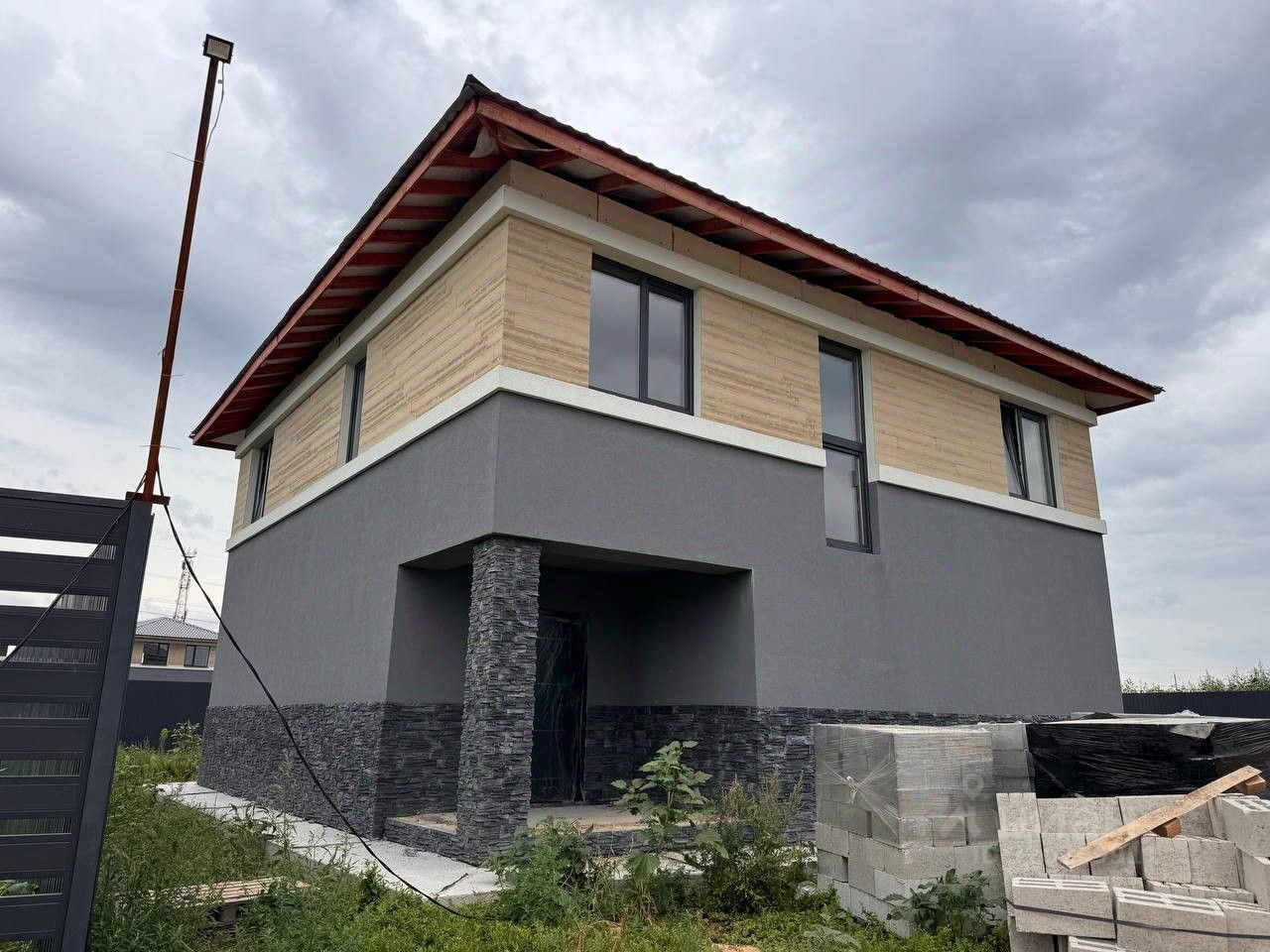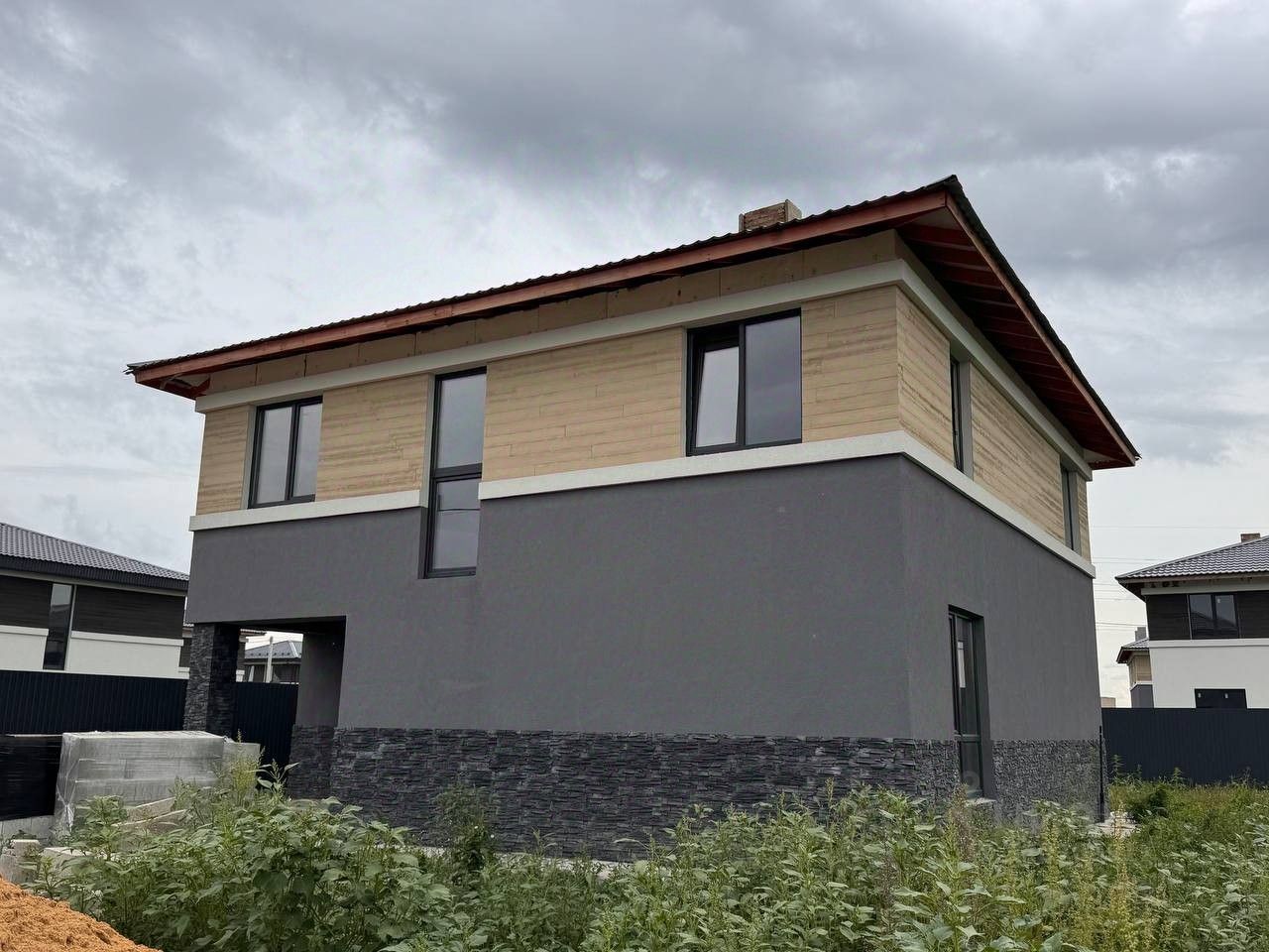 3Стильную отделку с фасадной штукатуркой и элементами имитации древесины и декоративный камень .