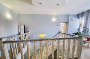 Высокие потолки более 3 м - создают ощущение простора и свободы, а приятная пастельная цветовая гамма лестничной площадки, ведущей на 2й этаж, передают пространство и воздушность холла.