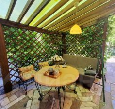 Участок оформлен с особым вниманием - площадка для отдыха, обвитая виноградной лозой, защитит от ветра