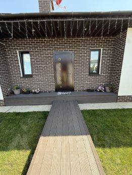 Веранда крытая с освещением с возможностью выхода на улицу с двух сторон дома из взрослой спальни, либо из гостиной. На участке посажены туи, две яблони и черешня. За домом три теплые грядки из терасной доски. Весь участок засеян газоном. Подсветка дома по всему периметру, плюс гирлянда. Придомовая территория участка газон и декоративный забор и туя. Асфальтированная парковка - навес на 2 машины. Плюс открытая парковка на 2 машины. Септик на 4 кольца + переливная на 4 кольца. Вывоз мусор - 3 раза в неделю, бак около дома.
