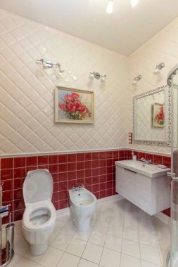 Сан/узел хозяйской спальни (стены и пол) выложен итальянской плиткой ручной работы Giallo Maya (royal).