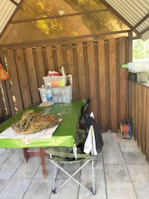 Беседка , теплица 6*3 м. Не заброшенная. Сажаю каждый год. Вагончик для хоз.нужд. Свет проведен в вагончик.