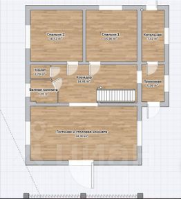 1-й этаж: кухня-гостиная с выходом на террасу, две спальни (или спальня + кабинет), ванная комната, отдельный санузел, прихожая, котельная