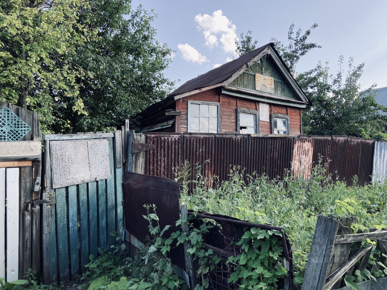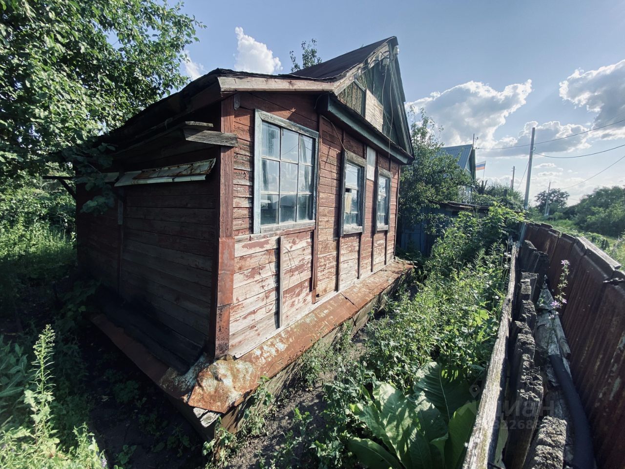 На участке есть дачный домик и насаждения.