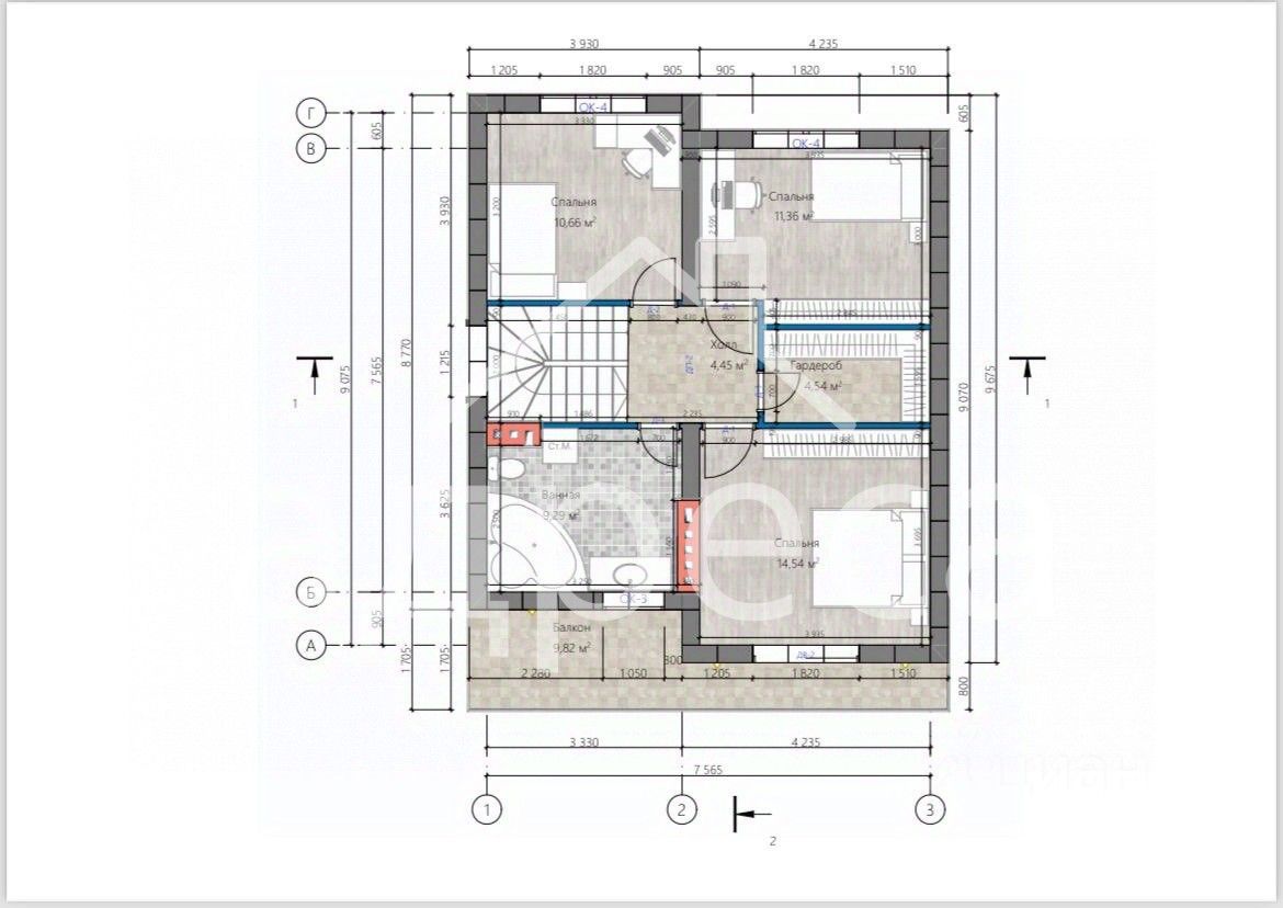 Второй этаж: три спальни, гардеробная и санузел.