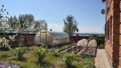 Есть теплица 83 метра и огородик с высокими грядками. В саду растут яблони, сливы, вишни, абрикос, смородина, крыжовник, жимолость, клубника. Отдельно за гаражом большой участок с малиной.По всей территории растёт много цветов и есть ухоженный газон.