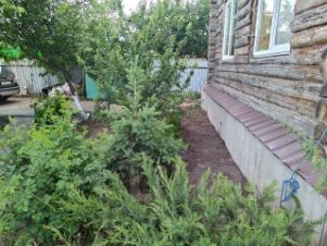Территория огорожена хорошим забором, есть теплица, беседка, место под бассейн (каркас сняли на зиму, а в бассейн можно было нырять прямо из бани), бетонированные дорожки, площадка для автомобиля, хоз.помещения.