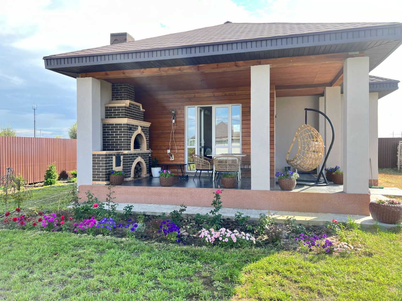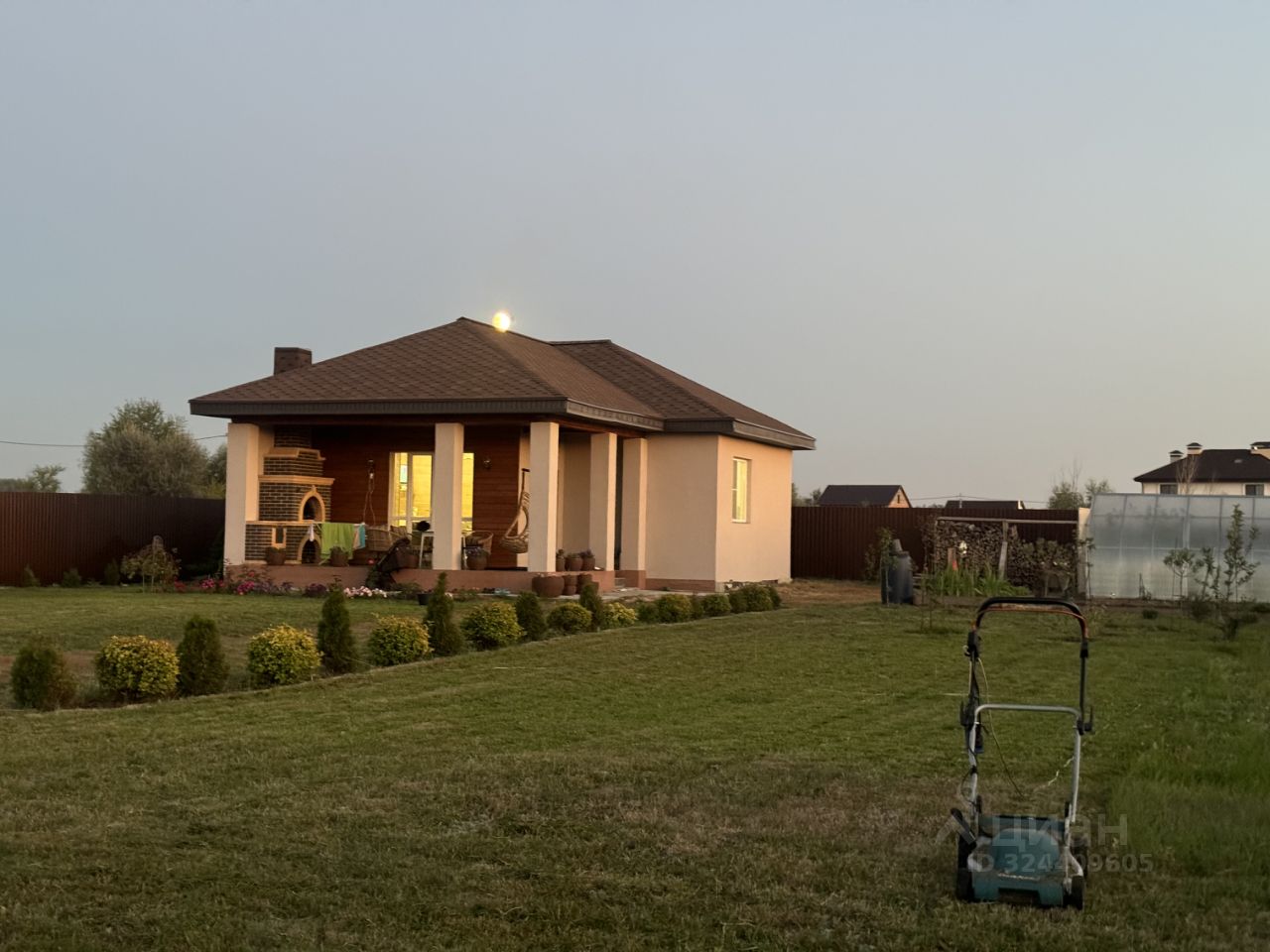 Огорожен проф листами, засеян газоном, посажены сосны, туи, яблоня, смородина и множество цветов.