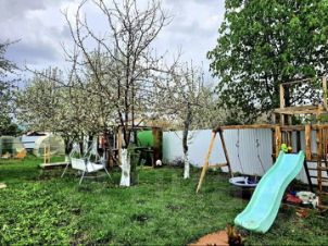 Земельный участок площадью 10 соток имеет правильную прямоугольную форму, категория земель населенных пунктов, под ИЖС: здесь расположены теплицы, беседка, детская площадка и зеленые насаждения, установлен забор по всему периметру участка. Вся необходимая инфраструктура для постоянного проживания находится в шаговой доступности.