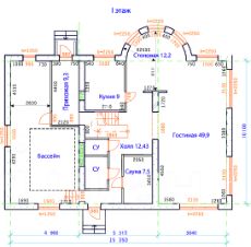 Чаша бассейна внутри дома на отдельном фундаменте. Рядом сауна и зона отдыха. Влажные зоны отделены.