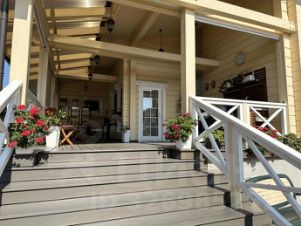 Террасная доска - натуральная лиственница. Веранда укомплектована импортной деревянной садовой мебелью.