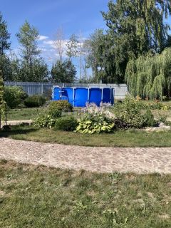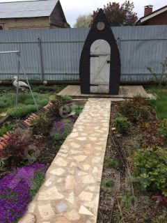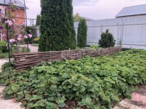 Участок полностью огорожен профлистом, все дорожки забетонированы, территория ухожена — высажены туи, ели, плодовые деревья, кустарники и клубника.