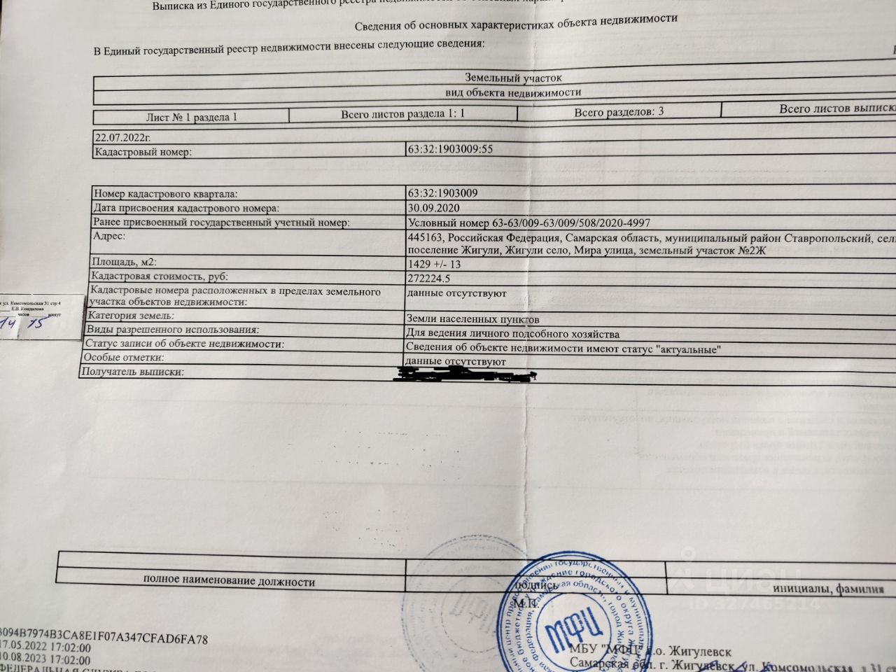 Продаю земельный участок в границах села Жигули, кадастровый номер - 63:32:1903009:55.Участок расположен немного на возвышенности, напротив лесополосы. Возможен торг. Риэлторов просьба не беспокоить. Точный адрес можно увидеть по кадастровому номеру. Категория земли: земли населённых пунктов. До соседа примерно 200 метров.