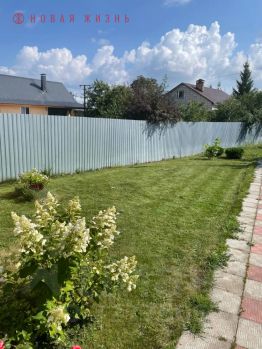Участок облагорожен, металлический забор, плитка на участке, плодовые деревья, газон.