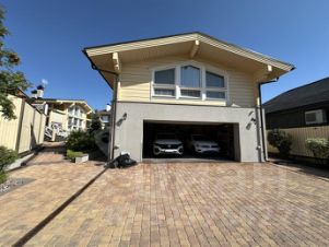Гараж рассчитан на две машины типа внедорожник, теплый, есть вывод для воды. По периметру смонтированы металлические стеллажи для хранения. Погреб оборудован стеллажами, пол плиточный.