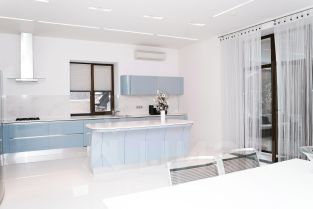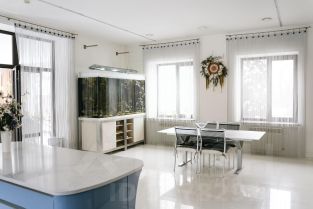 - кухня с островом и обеденная зона - 47 м2. Особенностью данного пространства является настоящий морской удивительный мир в аквариуме, находящимся возле обеденной зоной и выход на террасу 45 м2, из которой открывается панорамный вид на сказочный участок;